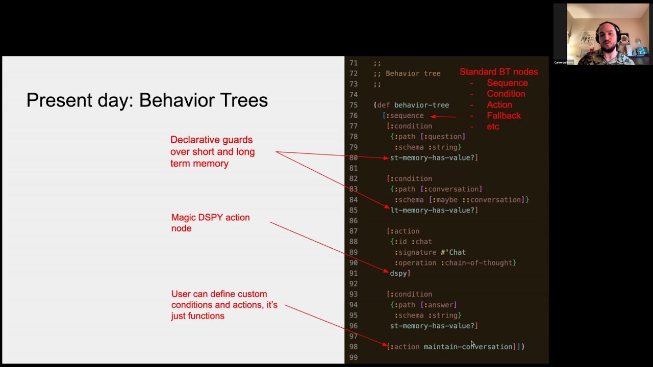 During the talk, Cameron discussed a few of the underlying concepts: behavior trees, event sourcing, interop with DSPy, and Malli schemas.